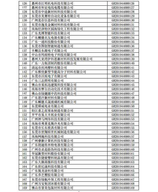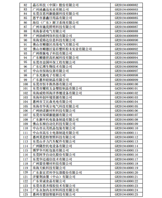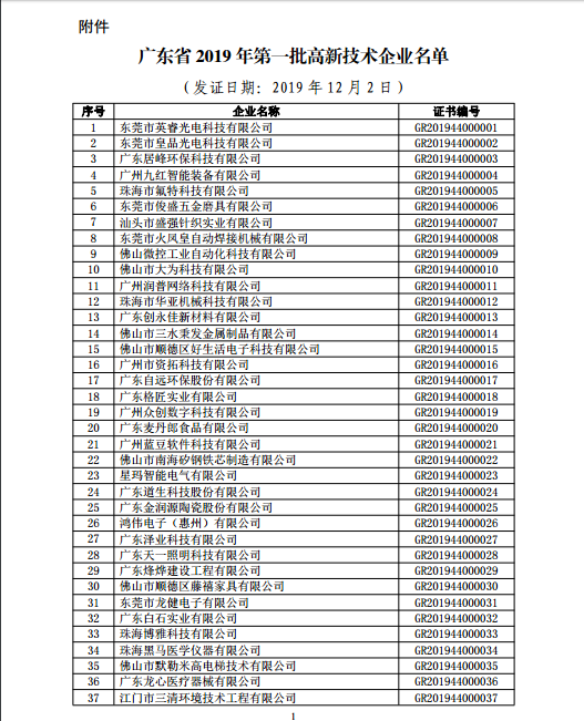 你們上報(bào)的《關(guān)于廣東省2019年高新技術(shù)企業(yè)認(rèn)定備案的函》(粵科函高字〔2019〕1730號)收悉。現(xiàn)將公示無異議的東莞市英睿光電科技有限公司等3202家企業(yè)予以高新技術(shù)企業(yè)備案。請你們按照《廣東省2019年第一批高新技術(shù)企業(yè)名單》(詳見附件)中的企業(yè)名稱、高新技術(shù)企業(yè)證書編號和發(fā)證日期打印并頒發(fā)“高新技術(shù)企業(yè)證書”。