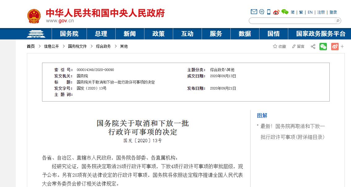 經研究論證,國務院決定取消29項行政許可事項,下放4項行政許可事項的審批層級,現予公布。另有20項有關法律設定的行政許可事項,國務院將依照法定程序提請全國人民代表大會常務委員會修訂相關法律規定。